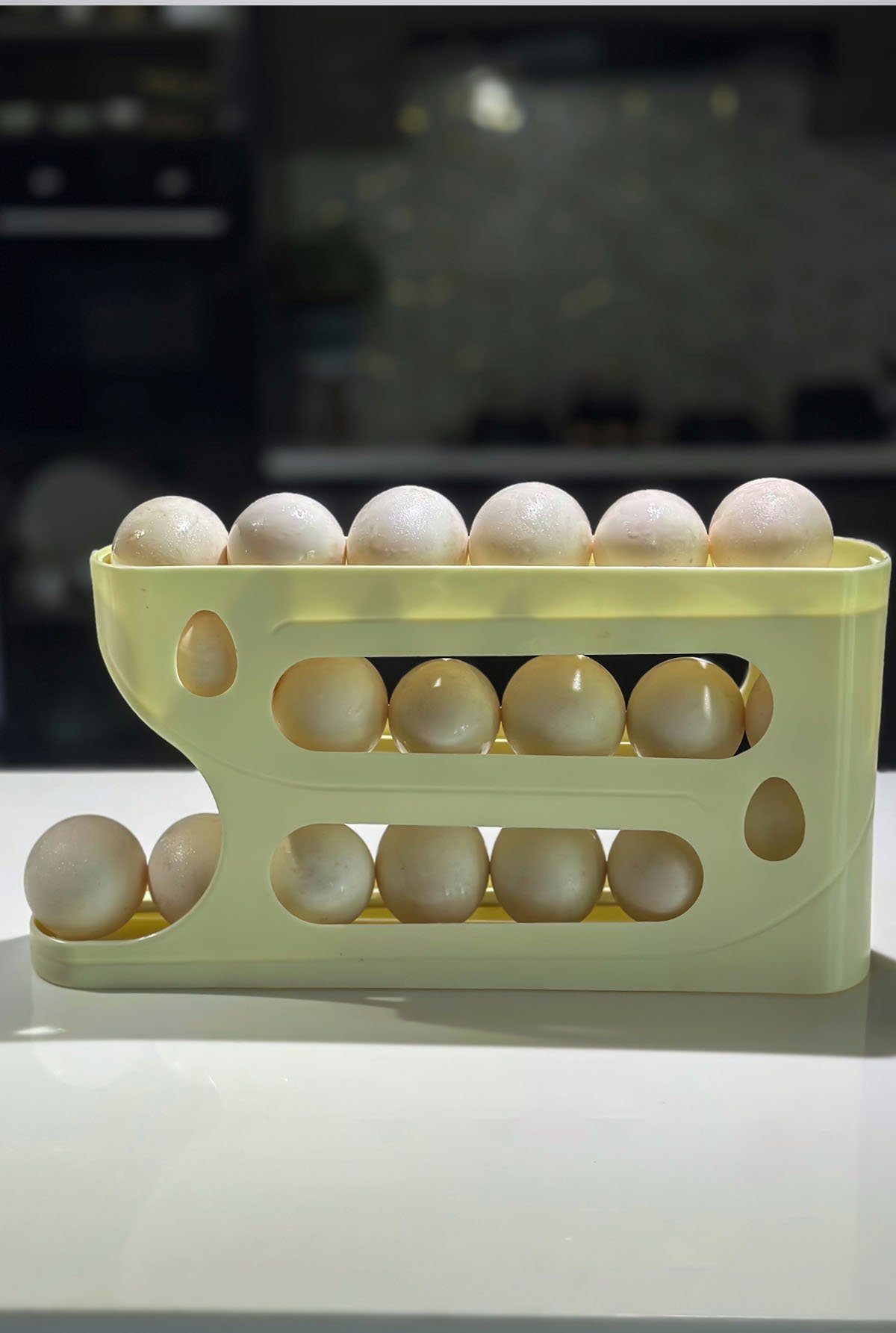 Keep your kitchen neat and your eggs fresh with our durable egg storage tray. Designed with a gravity-rolling system, this tray automatically dispenses eggs one by one for easy access. The three-tiered design holds multiple eggs securely while saving space in your refrigerator or countertop.